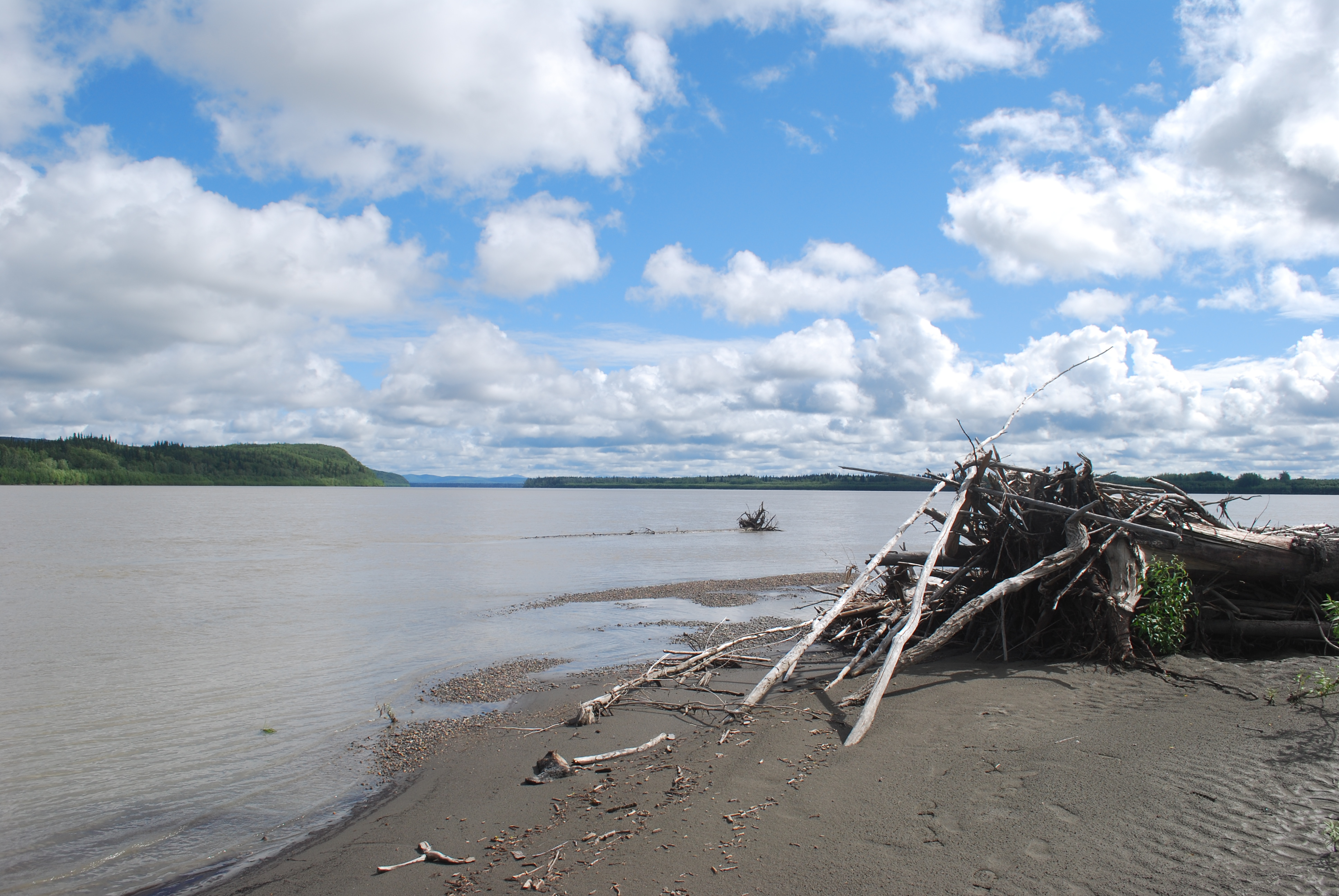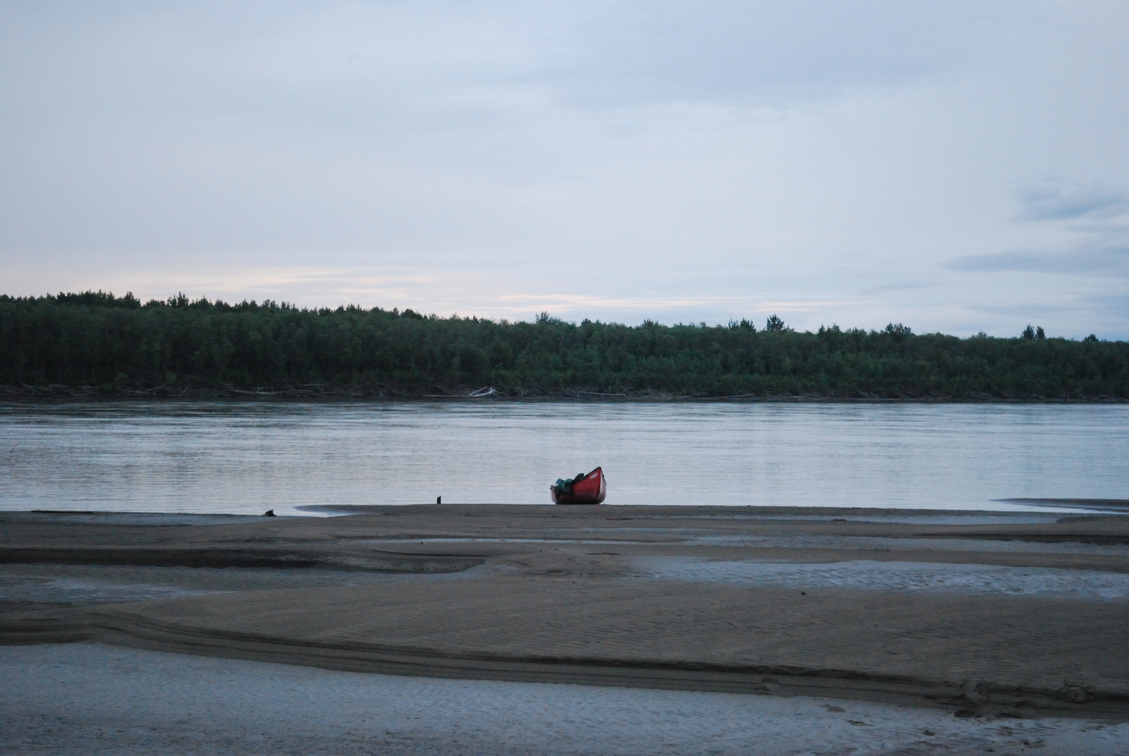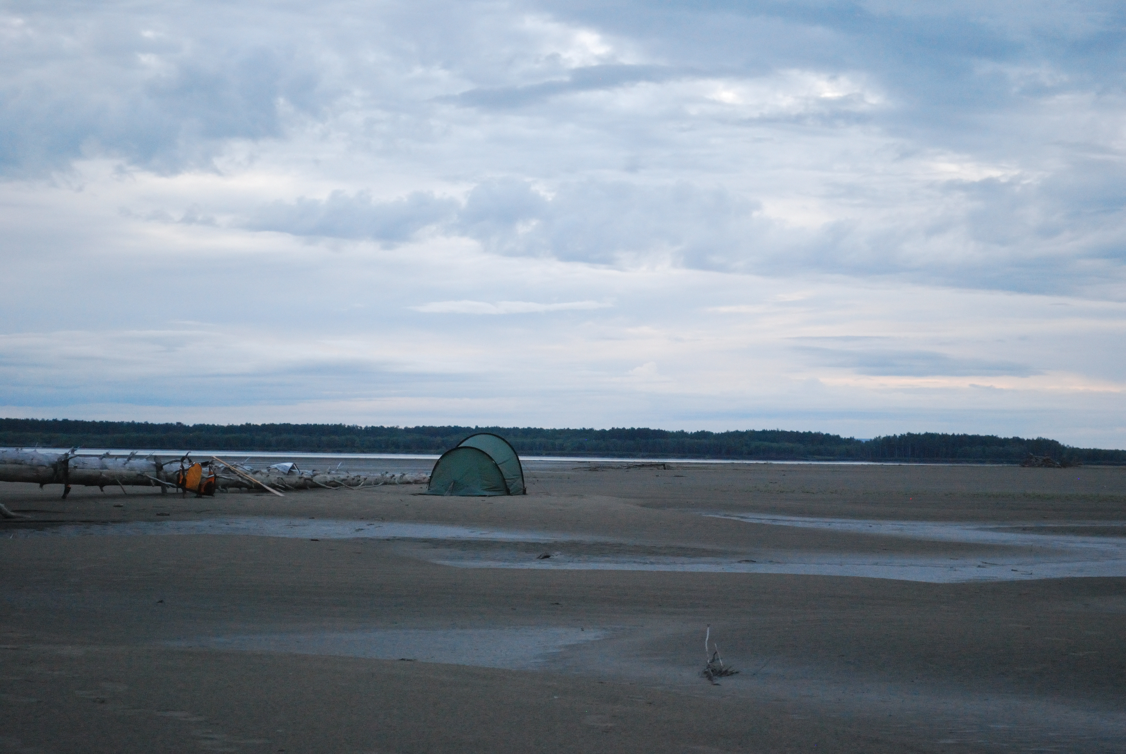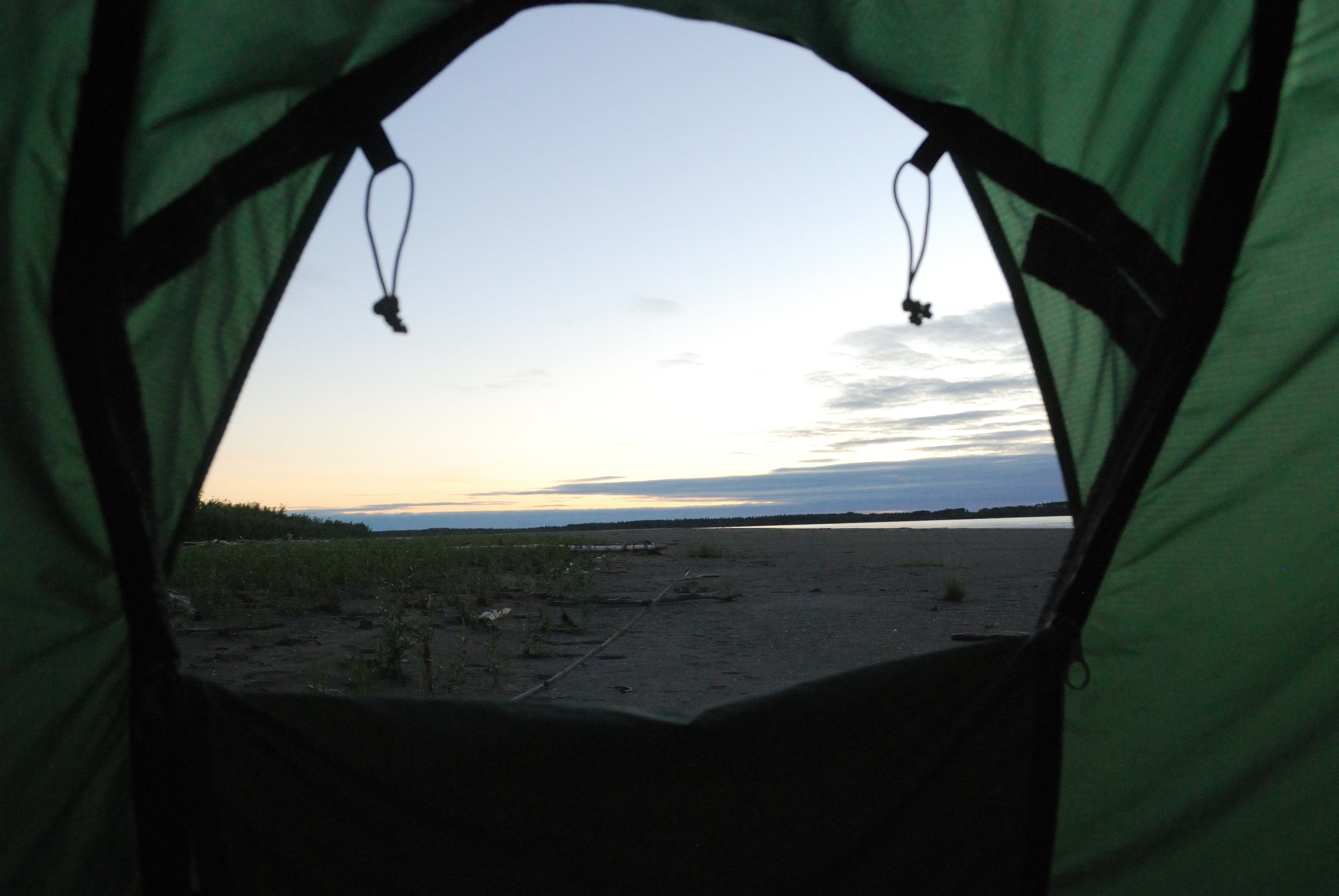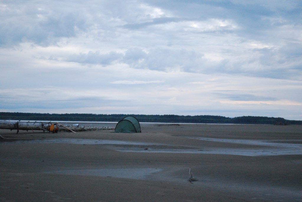 Bei Jack angekommen, versuchten wir zunächst, das Boot angebunden hinter Jacks Skiff herzuziehen. Aus hydrodynamischen Gründen, die ich bis heute noch nicht ganz verstanden habe (es hat vermutlich damit zu tun, dass der Bootstyp Wenonah Prospector (kein Kiel) a priori keinen ganz vorn zentrierten Anbindepunkt hat, evtl. auch mit dem nach vorn verlagerten Schwerpunkt wenn niemand im Boot sitzt), kann mann ein Kanu aber nicht „geradewegs“ im Wasser ziehen. Es schlingert links und wieder rechts und je schneller man „fährt“, desto gefährlich näher kommen die Wendepunkte eine Kenterung – wir gaben es recht schnell auf und ich setzte ab dann die Reise wieder mit Strömung und Muskelkraft fort. Jack verschwand winkend in einem Seitenarm und überlies mich dem Yukon. Es dauerte nicht lange, bis der angekündigte Regen einsetzte. Da die Paddelhose mittlerweile zur Everyday-Pinte aufgestiegen war, hampelte ich nur mit der Regenjacke – gerade noch rechtzeitig. Es schüttete buchstäblich aus Eimern, wie ich es noch nie erlebt habe. Ich fing an, das Boot mit dem aufgeschnitteten Milch-Kanister leerzuschöpfen und hatte schon Sorge, dass ich nicht schnell genug sei, aber nach ca. einer halben Stunde war der Spuk vorüber. Die Wolken dunkelten jedoch immer noch alles ab. Sowohl GPS als auch meine manuell korrigierte USGS-Karte ließen mich im dunklen „da vorne müsste doch die Sandbank kommen“ schlussfolgern. Aber es tat sich nichts. Jacks Beschreibung nach müsste ich auch erst nach links schwenken, bevor ich etwas zu Gesicht bekäme. Das erste mal auf dieser Tour holte ich das Fernglas heraus. Mühsam suchte ich im Restlicht den Horizont ab – nichts. Nervös paddelte ich weiter, es wurde dunkler und dunkler, doch schließlich erschien am Horizont ein hoch aufragendes Etwas im Bild. Treibholz. Die Sandbank wird doch jetzt wohl nicht dank des Schauers überspült worden sein? Nein, war sie nicht. Ich konnte nach einiger Zeit beruhigt anlanden – eine riesige Sandbank ohne Mücken erwartete mich. Ein absoluter Traum. Zwar gab es hier und da ein paar Pfützen und ich musste das Boot zur Sicherheit weit an Land aus dem Wasser holen, aber es war wirklich unglaublich schö hier. Weit und breit Sand und beste Zeltmöglichkeiten – ich schlug meines natürlich an dem riesigen Baumstamm auf, den ich aus der Ferne gefunden hatte. Ich konnte wirklich beruhigt schlafen gehen.