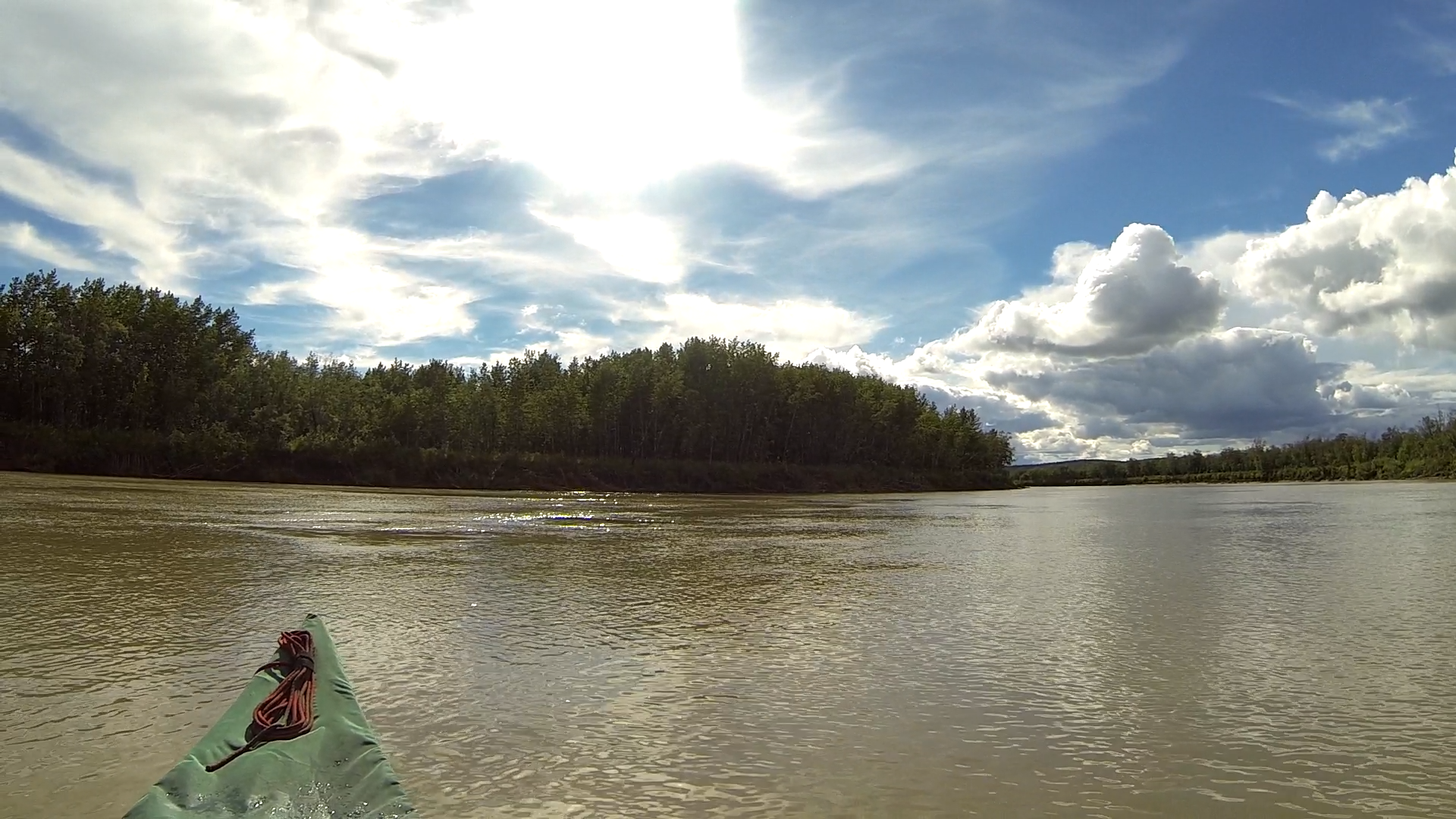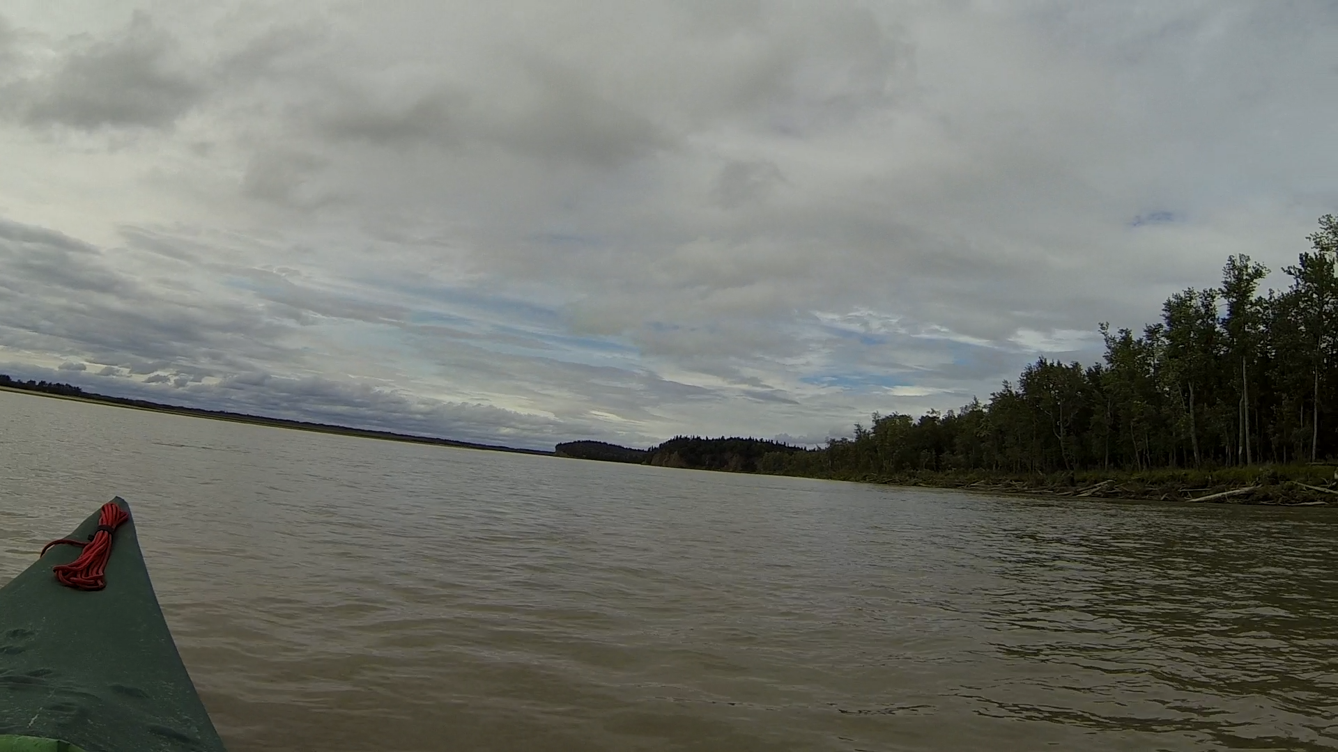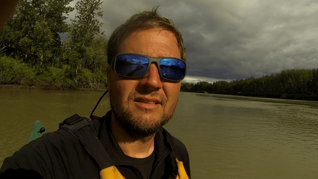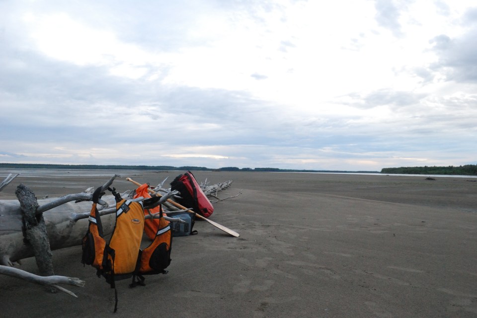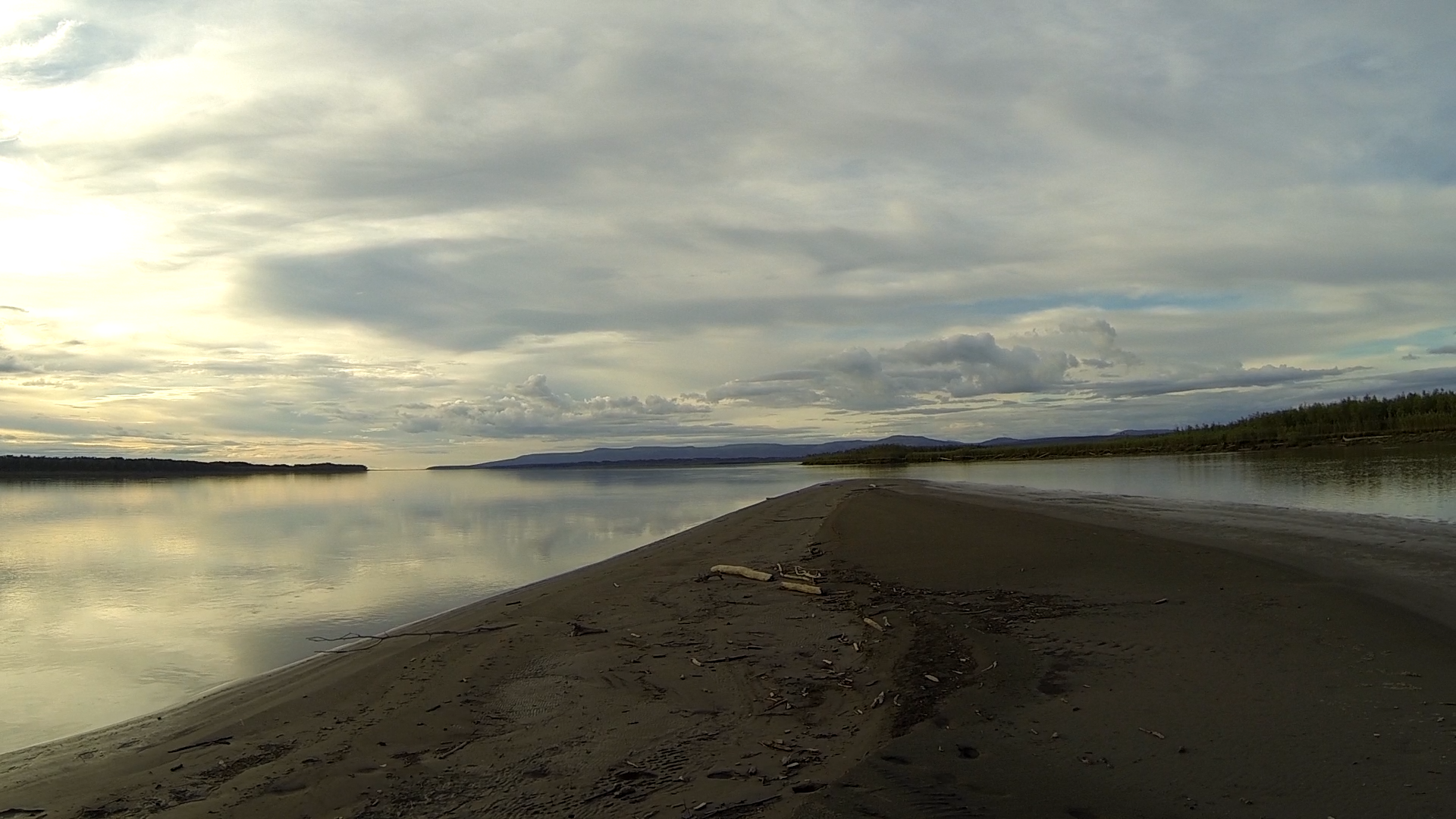 Bei Jack angekommen, versuchten wir zunächst, das Boot angebunden hinter Jacks Skiff herzuziehen. Aus hydrodynamischen Gründen, die ich bis heute noch nicht ganz verstanden habe (es hat vermutlich damit zu tun, dass der Bootstyp Wenonah Prospector (kein Kiel) a priori keinen ganz vorn zentrierten Anbindepunkt hat, evtl. auch mit dem nach vorn verlagerten Schwerpunkt wenn niemand im Boot sitzt), kann mann ein Kanu aber nicht „geradewegs“ im Wasser ziehen. Es schlingert links und wieder rechts und je schneller man „fährt“, desto gefährlich näher kommen die Wendepunkte eine Kenterung – wir gaben es recht schnell auf und ich setzte ab dann die Reise wieder mit Strömung und Muskelkraft fort. Jack verschwand winkend in einem Seitenarm und überlies mich dem Yukon. Es dauerte nicht lange, bis der angekündigte Regen einsetzte. Da die Paddelhose mittlerweile zur Everyday-Pinte aufgestiegen war, hampelte ich nur mit der Regenjacke – gerade noch rechtzeitig. Es schüttete buchstäblich aus Eimern, wie ich es noch nie erlebt habe. Ich fing an, das Boot mit dem aufgeschnitteten Milch-Kanister leerzuschöpfen und hatte schon Sorge, dass ich nicht schnell genug sei, aber nach ca. einer halben Stunde war der Spuk vorüber. Die Wolken dunkelten jedoch immer noch alles ab. Sowohl GPS als auch meine manuell korrigierte USGS-Karte ließen mich im dunklen „da vorne müsste doch die Sandbank kommen“ schlussfolgern. Aber es tat sich nichts. Jacks Beschreibung nach müsste ich auch erst nach links schwenken, bevor ich etwas zu Gesicht bekäme. Das erste mal auf dieser Tour holte ich das Fernglas heraus. Mühsam suchte ich im Restlicht den Horizont ab – nichts. Nervös paddelte ich weiter, es wurde dunkler und dunkler, doch schließlich erschien am Horizont ein hoch aufragendes Etwas im Bild. Treibholz. Die Sandbank wird doch jetzt wohl nicht dank des Schauers überspült worden sein? Nein, war sie nicht. Ich konnte nach einiger Zeit beruhigt anlanden – eine riesige Sandbank ohne Mücken erwartete mich. Ein absoluter Traum. Zwar gab es hier und da ein paar Pfützen und ich musste das Boot zur Sicherheit weit an Land aus dem Wasser holen, aber es war wirklich unglaublich schö hier. Weit und breit Sand und beste Zeltmöglichkeiten – ich schlug meines natürlich an dem riesigen Baumstamm auf, den ich aus der Ferne gefunden hatte. Ich konnte wirklich beruhigt schlafen gehen.