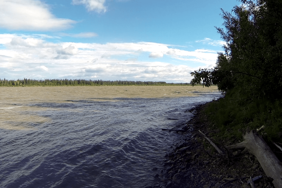 Das Wetter nahm schnell den unruhigen, nieseligen und windigen Zustand wieder an. Die Strecke bis zum nächsten Dorf, Anvik, war nur 19 Meilen weit. Es kann nur besser werden, dachte ich. Dachte ich… Der Wind frischte auf, obwohl es schon nachts war. Es war wegen des schlechten Wetters dunkler als sonst und das Ufer zur rechten Hand bestand fast ausschließlich aus Abbruchkanten, wie ich sie schon am Südufer von Koyukuk Island hatte, mit unruhigem Wasser, dass durch den Gegenwind noch unruhiger wurde. Kein Platz zum Anlegen und es regnete munter weiter. Ich erinnerte mich gruselnd an eine Geschichte von Igor aus 2014, der sich in den Flats bei Sturm unter einer überhängenden, wankenden Abbruchkante festgefahren hatte. Brrr… Es half alles nichts. Weiterpaddeln. Weiterpaddeln. Weiterpaddeln. Erst kurz vor Anvik wurde es besser, so dass ich die freie Fläche (vor der ich schon Respekt aufgebaut hatte) an der Mündung des Anvik Rivers gefahrlos queren und das Stückchen des Anvik Rivers so hinaufpaddeln konnte, damit ich Anvik nicht verpasste. Völlig durchnässt, durchgefroren und ausgepowert erreichte ich Anvik und fand bei der  zweiten Ausstiegsmöglichkeit eine gute Anlegestelle, neben der über einem Steilufer ein schöner Platz zum Zelten vorzufinden war. Ein kleiner schicker Unterstand war auch da, den ich (nachts um halb drei) flugs in Beschlag nahm um meine Sachen zu trocknen. Es wirkte hier vieles friedlicher. Nur die Mücken waren furchtbarer als sonst; mit schweren Verlusten entkam ich ins Zelt. Was für ein Vergleich mit Grayling. Zutiefst beruhigt schlief ich ein.