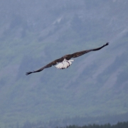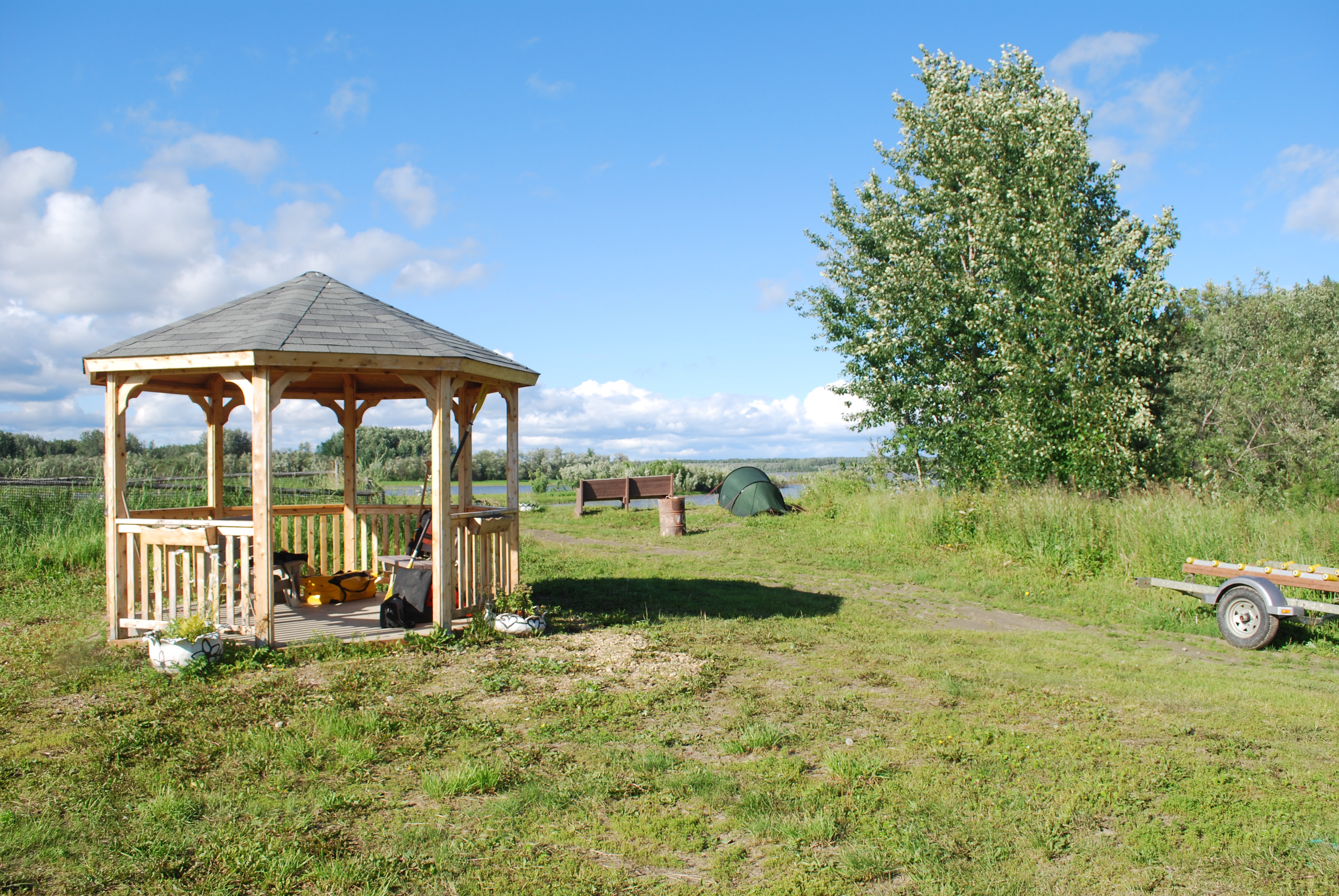 Es war etwas windig, aber im großen und ganzen war das Wetter ok. Also brach ich auf. Ich „wartete“ allerdings schon darauf, wann mich Freund Wind wohl am Ufer Pause machen schickt. Und tatsächlich, er verleidete mir das Paddeln ungeführ nach 5 Meilen – ich machte halt am zweiten Fishwheel des Tages. Die Fishwheels funktionieren übrigens so: An einer Achse sind drei bis vier Fangkörbe angebracht und werden durch die Strömung in Rotation versetzt (Öffnung in Strömungsrichtung). Das funktioniert, da außen am Boden des Korbes eine Plane angebracht ist, die im Wasser (von unten) gegen den Korbboden gedrückt wird, beim Herausheben aus dem Wasser aber den Kontakt zum Boden verliert und so die Umdrehungen des Rades überhaupt erst ermöglicht (die Plane ist nur an der Seite des Korbes angebracht, die am nächsten zur Achse ist). Die Lachse schwimmen flussaufwärts und damit in die Fangkörbe. Bevor sie da raus gefunden haben, wird der Korb aber schon aus dem Wasser gehoben. In der Mitte ist dann eine Rutsche, in die die Lachse beim weiteren „Hochfahren“ aus dem Wasser hereinfallen. Und am Ende der Rutsche in einer Kiste (auf einem Haufen weiterer Lachse) landen. Die Fishwheels werden immer in bzw. kurz vor Beginn von Kehrwassern eingesetzt, denn Lachse lieben das Kehrwasser – die Strömung verläuft dort anders und sie können so Energie sparen.