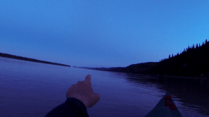 Auf das Fishwheel passten Bradley uns ein Vater mit seinem Sohn auf (deren Namen habe ich leider vergessen). Es gab schon wieder Kaffee und während der Wind vorüber pfiff, machte ich unter dem Schutzdach ein kleines Nickerchen. War ja schon Schwerstarbeit heute. Irgenwann wird sowas natürlich langweilig. just als mir das bewusst wurde, kam ein Motorboot vom Fishwheel flussaufwärts. Jemand bat um Hilfe, denn das Fishwheel hatte sich teilweise aus der Verankerung gelöst. Ich nutze die Gelegenheit und bot meine Hilfe an. Schon saß ich mit im Boot flussaufwärts. Als Dankeschön gabs zum Abschied, als der Wind ein wenig abgeflaut hatte, zwei Whitefish mit auf den Weg. Die konnte ich recht bald zubereiten, denn nach ungefähr nur einer weiteren Meile nach der nächsten Biegung pustete es wieder so stark flussaufwärts, dass ich gefühlt stehen blieb. Ich arbeitet mich noch zur nächsten Hütte in Sichtweite vor und verkroch mich darin samt Whitefisch, den ich mir dort schmurgelte. Während ich also so in der Hütte (die keineswegs allzu massiv war) hockte, merkte ich, dass das hier eine extrem blöde stelle zum Ausharren war. Die Hütte war nicht mückendicht – schon gar nicht bärensicher – und roch jetzt nach Bratfisch. Und auch drumherum kein ordentlicher Platz für das Zelt. Also machte ich bei nächster Gelegenheit los – nur um nach zwei Meilen entnervt beim nächsten Fishwheel halt zu machen. Hier passte Dakota, ein 21jähriger Musiker auf das Rad auf. Er lud mich ein, bei ihm den Wind auszuwarten – die Einladung nahm ich natürlich gerne an. Dakota hatte Verwandschaft in Kaltag, wollte aber eigentlich mit seiner Musik sein Geld verdienen. Dies hier war ein Sommerjob für ihn. Vor mir sei eine Gruppe von Litauern im Kanu unterwegs, ca. 4-5 Tage voraus, erzählte er mir. Auch, wie er vor kurzem erst einen Bären verscheuchen musste, der die im Überfluss gefüllte Kiste mit den Lachsen gerochen hatte. Die Fishwheels brauchen natürlich einiges an Tiefgang und sind daher ein Stückchen weit weg vom Ufer. Mit dem „Festland“ sind sie nur über einen furchtbar schmalen Stag verbunden (siehe zB Foto oben). Diesen Steg konnte Dakota dann auch „halten“ gegen den Bären, indem er mit Stock und Stimmbändern richtig Randale machte. Ein Gewehr wie der Mann am allerersten Fishwheel vor Kaltag bei Benedum Landing hatte Dakota nämlich nicht dabei. Erstaunlich, wie unterschiedlich Menschen damit umgehen. Dakota musste allerdings am Ende doch einen Lachs rüberwerfen, so hartnäckig war der Bär. Der Bär sei trotz seines „Erfolgs“ trotzdem noch nicht wieder da gewesen. Was ein Glück. Ich leistete Dakota noch Gesellschaft, bis der Wind nachließ. Da war es schon 23.00 Uhr! Er gab mir noch einen King Salmon mit, den ich im Müllbeutel verpackt auslaufsicher am Bootsboden (Kühlschrank, solange man paddelt!) verstaute. Erstaunlich, wie der Wind immer nachts nachlässt, sobald die Sonne verschwunden ist. Ich konnte (musste?) noch vier stunden durch eine wunderbare Nacht paddeln. Das kannte ich ja schon aus den Flats, aber ich war mir nicht sicher, ob ich die ganz Nacht hindurch etwas sehen würde. Es klappte aber wunderbar, auch wenn es gegen halb zwei schon anstrengend wurde, Dinge richtig zu erkennen. Aber glücklicherweise erkanne ich die Dinge noch – ein Schwarzbär trottete am Ufer entlang, und einen Wolf bekam ich auch zu sehen: Als ich auf die Kehle einer Linkskurve zupaddelte, bemerkte ich eine merkwürdige Kontur am Ufer, vor einer Mini-Lichtung. Ich paddelte nun ganz vorsichtig und langsam darauf zu und versuchte im Dämmerlicht auszumachen, was es sein könnte. Sogar so vorsichtig, dass ich mich nicht traute, die Kamera auszupacken… schließlich erhob sich die Kontur und entpuppte sich als großer Wolf. Er schaute mich kurz an und verschwand im Dunkel hinter der Mini-Lichtung. Weg, das war’s schon. Was für wunderschöne Tiere. Noch ganz beseelt von den Eindrücken erreichte ich um 3 Uhr morgens Morgan Island. Ich baute schnell alles auf, legte den King Salmon im Mülltbeutel ins Yukon-Wasser zur Kühlung und beschwerte alles mit einem Stein. Dann, endlich, war pennen angesagt.