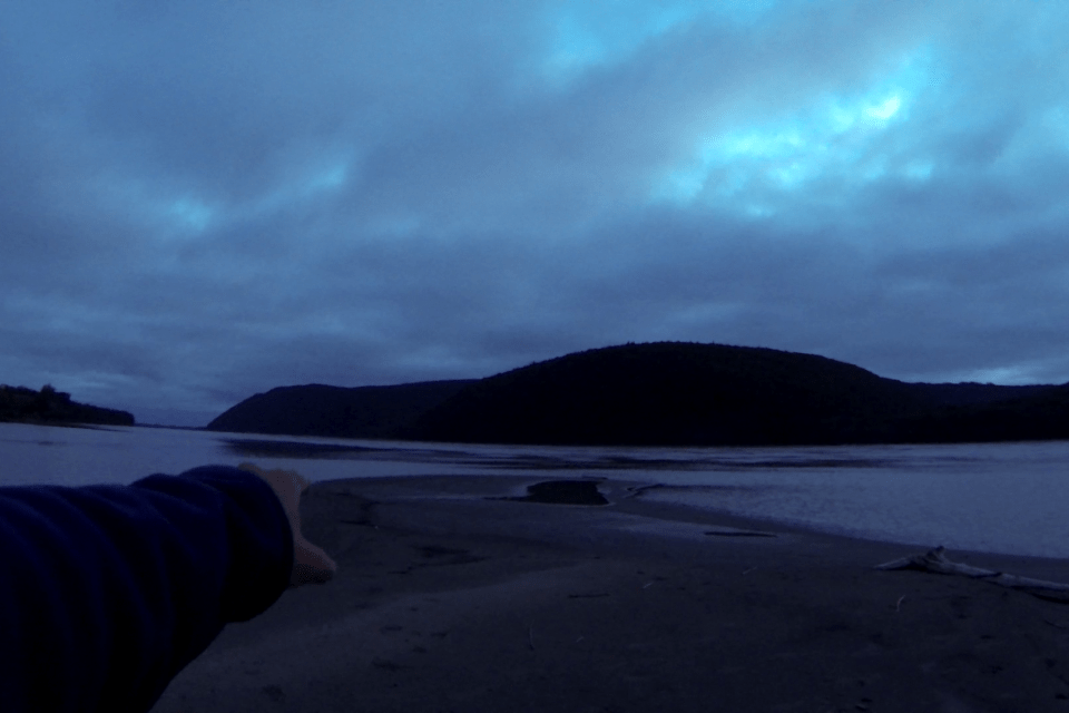 Nach der kurzen Aufregung um eine Zeltmöglichkeit gegenüber Paimut Island (USGS-Karte Russian Mission) verlief die Nacht wunderbar ruhig, und am Morgen war es nahezu windstill. Der Wasserstand war sogar gesunken über Nacht. Ohne auf die Uhr zu gucken paddelte ich los und machte nach ca. 13 Meilen kurz Pause auf eine Insel. Der Strand war sehr flach, ich zog das Boot nicht komplett raus, sondern so, dass es „eigentlich nicht wegschwimmen kann“ und nahm das Bootsseil mit zu mir: Ich breitete eine Plane aus und legte mich stumpf drauf, das Bootsseil an meinem Gürtel festgebunden. Während ich in den blauen Himmel guckte, schlief ich ein. Als ich aufwachte, war das Boot… natürlich noch an Ort und Stelle. Ich verleibte mir einen Müsliriegel ein, trank einen Schluck Kaffee aus der Thermoskanne und taperte ein wenig über den Strand. Da waren frische Fußspuren – barfuß! Und eine rinnenartige Schleifspur parallel dazu. Hier ist jemand mit einem Kajak unterwegs und hat es hier barfuß hinter sich her über den Strand gezogen, sherlockte ich in mich hinein. Anders konnte ich mir dieses Arrangement an Spuren jedenfalls nicht erklären, so absurd das auch wirkte. Nachdem sich Rinne und Fußspuren ein wenig Richtung Ufer verliefen, blickte ich mich in einem leicht paranoiden Anfall zu meinem Boot um – es war noch da. Dennoch begann ich ein kleines bisschen an meinem Geisteszustand zu zweifeln – barfuß… und das mit den Mücken. Obwohl… das war ja schon lange nicht mehr so schlimm hier. Ich beschloss, bei der nächsten guten Gelegenheit das Nachtlager zu machen und keine Höllenritte mehr zu veranstalten.