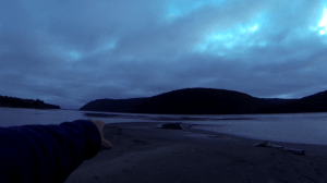 Als ich aufwachte, war der Schlafsack von außen nass. Aber nur Kondenswasser. Ich aß wenig und baute schnell alles ab, als ich dunkle Wolken aufzeiehen sah. Es blieb aber alles trocken. Kurz nach dem Ende von Grand Island sah ich den wohl größten Schwarzbären meiner Outdoorkarriere – gut, dass ich dem nicht direkt begegnet bin. Danach frischte es auf und es fing an zu nieseln. Na prima, „a hell’s night lässt grüßen“ machte ich mir ins Hemd und beschloss, kurz vor Devil’s Elbow noch einmal Pause auf Elsie Island zu machen. Ich querte die (viel größer als die Karte zu vermuten ließ) freie Passage auf dem Wasser und kämpfte mit dem Wind. Die Insel war ein guter Rastplatz – zur Not konnte ich hier ausharren, wie der Reisebericht empfahl. Während ich den Wind abwartete, streunte ich über die Insel und fand erneut Fußspuren – der Kerl mit der Plane war natürlich vor mir hier – diesmal auch von einer größeren Gruppe (nicht barfuß). Als der Wind nach zwei Stunden nachließ, fasste ich mir ein Herz und brach auf. Denn nichts ist schlimmer, als mit einer ungewissen Aussicht schlechtes Wetter rumzuwarten. Es blies mir fröhlich weiter ins Gesicht, die Wellen kamen und schließlich auch der Regen. Yippie-Yah-Yeah, Schwe****acke! Es wurde furchtbar kalt, auch wenn ich mich mit aller Kraft paddelte. Und warum eigentlich kam der Wind IMMER von vorn – ich habe doch hier eine fast 90°-Biegung genommen. Wie geht das? Ganz plötzlich ließ der Wind nach, mir wurde wieder warm und das Wasser war auch nicht mehr wehrig. „Das geht doch gar nicht!“ dachte ich mir. Egal. Pause auf dem Wasser. Schnell die Position mit dem GPS gecheckt – es war 17 Uhr und ich war vorbei an den schäbigen Stellen! Ich legte einen Teil der Kleidung wieder ab. Heute war alles dabei – ein Schwarzbär, Sturm und Regen, jetzt Sonnenschein und Windstille.