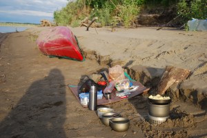 Die Nacht war noch ruhiger als die vorherige und der Wasserstand sank weiter, Bärenbesuch hatte ich nicht. Ich wollte mir heute die endlosen Biegungen sparen und wechselte dafür die Uferseite direkt nach dem Start, die Gelegenheit war gut. Die Sonne brannte unerbittlich auf das Wasser. Direkt vor Russian Mission querte ich den Fluß abermals und erreichte das Dorf gegen 16.30 Uhr nachmittags. Es gab keine richtig gute Stelle zum Anlegen und auch keine gute Zeltmöglichkeit in Nähe des Strandes oder gar am Strand, die nicht potentiell Gefahr lief, zufällig einer Quad im Weg zu sein – es war Freitag (20.07.) und die Dorfjugend hatt später am Abend bestimmt Langeweile. Nachdem ich mir in einem der Stores frische Äpfel gekauft und eine kalte Pepsi gegönnt hatte, besuchte ich das Tribal/City Office und fragte ich nach Internet und dem Wetterbericht. Man ließ mich schnell machen und sagte mir, ich sollte mich doch noch an einen Jon Pitkas wenden, wenn ich noch ein paar Infos über den Fluss bräuchte. Ich traf ihn bei Freischneiderarbeiten und wir gingen wieder zum Tribal Office, wo er mir eine Abkürzung nach Pilot Station verriet und auf der Karte markierte. Einen minimalistischen Paddler (nur Plane und Kajak) habe man auch gesehen. Und mit Nachdruck erklärte er mir, doch beim Devil’s Elbow, einer harten Flussbiegung, an der der Yukon von der aktuellen groben Fließrichtung West-Südwest auf Nordwest schwenkt, vorsichtig zu sein. Die Strömung ist stark und das Mini-Klima (Windrichtung) kippt an der Stelle auch häufig. Das machte mir nicht unbedingt gute Laune, denn der einzige brauchbare Reisebericht verlautete mit „This is a nasty place to get caught in a storm. The bending river boils up strange currents and there are few places to pull to shore along the bluffs. […] Be very cautious paddling through here: if the weather seems even slightly bad, just pull over and camp until it blows past.“ nichts gutes. Zusammen mit dem Wetterbericht (heute noch gut, morgen Regen und Wind) wurde ich etwas unruhig. Ich paddelte schnelle weiter, auch weil an meinem Boot sich bereits eine Traube aus neugierigen Kindern eingefunden hatte – hier würde ich niemals Ruhe bekommen 🙂 Ich paddelte noch ungefähr 10 Meilen weiter bis zu einer kleinen Insel gegenüber von Grand Island, die ich um ungefähr 20 Uhr erreichte. Diesmal baute ich noch die Strandmuschel mit auf, falls es am Morgen regnen sollte – dann konnte ich wenigstens trocken frühstücken. (Im Vergleich zu dem Kerl mit der Plane kam ich mir vor wie das andere Extrem und musste ein wenig über mich und meinen ganzen Plunder lachen.) Mit der Aussicht auf schlechtes Wetter und auf Devil’s Elbow, der noch ca. 12 bis 15 Meilen entfernt war, genehmigte ich mir ein fürstliches Abendessen im letzten Sonnenschein (gebratener Reis mit Rührei) und schlief sehr schlecht zu dem in der Nacht beginnenden Regen.