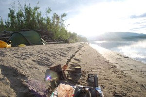 Blick auf den Yukon flussabwärts während der Wind das Geschehen beherrscht. Das Feuer brennt bei dem Wind gut und braucht viel Holz – das lässt der Langeweile keine Chance – die Axt ruft!