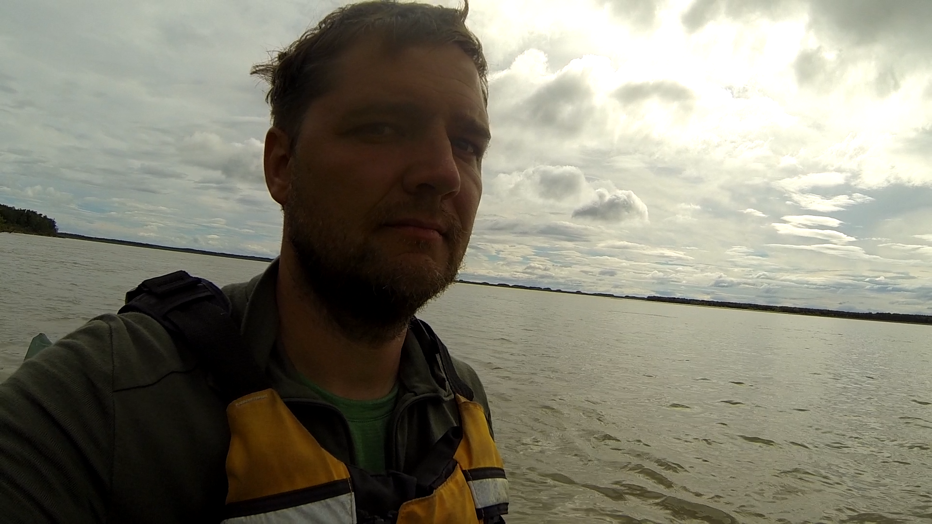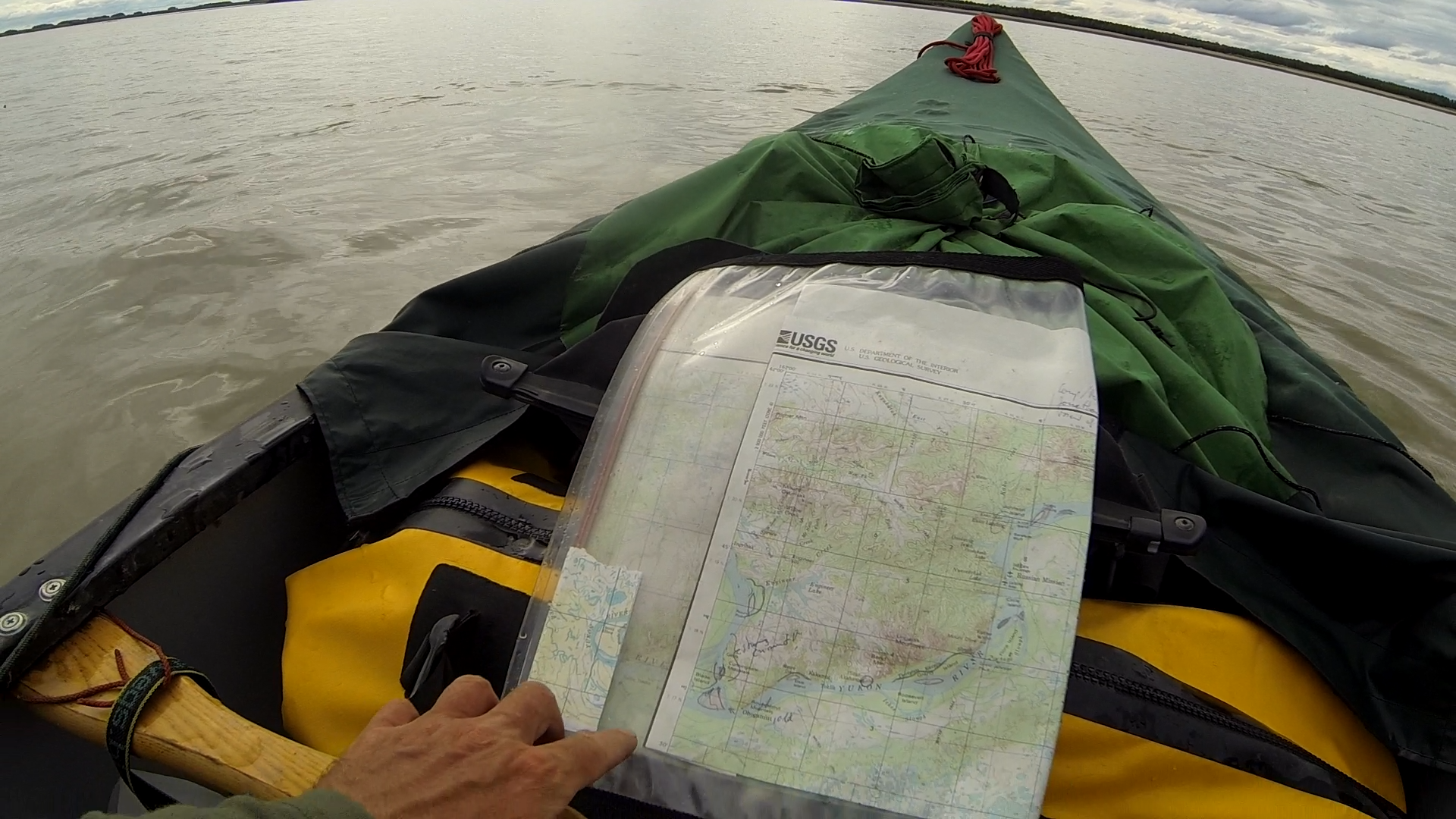 Ich schlief schlecht in der Nacht. Am Morgen rüttelten immer wieder leichte Böen am Zelt. Ich kroch heraus und baute pröddelnd-frühstückend das Lager ab. Offenbar hatte ich nicht so richtig Bock. Und der Wind kam diesmal als Rückemwind für heute aus Ost-Südost. Jon Pitkas aus Russian Mission hate mir noch eine Abkürzung des langgezogenen Bogens vor Pilot Station gezeigt, und mit Jack George hatte ich das noch einmal besprochen. An einer Stelle zweigt vom Yukon ein kleiner Seitenkanal ab, der direkt in den Atchuelinguk (orig. Chuilanuk) mündet. Von dort würde ich sehr einfach auf die Seite kommen, an der Pilot Station liegt – ohne die riesiege Wasserfläche queren zu müssen, in der von rechts gleichzeitig der Atchuelinguk einmündet. Bei der Windlage erinnerte mich das alles zu sehr an den ersten Versuch in den Yukon Flats, als auch von rechts die Wassermassen des Porcupines kamen und mit dem Wind zusammen ein allerfeinstes Arrangement abgaben…
