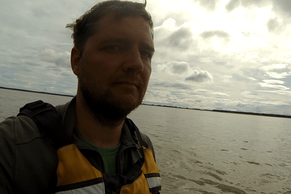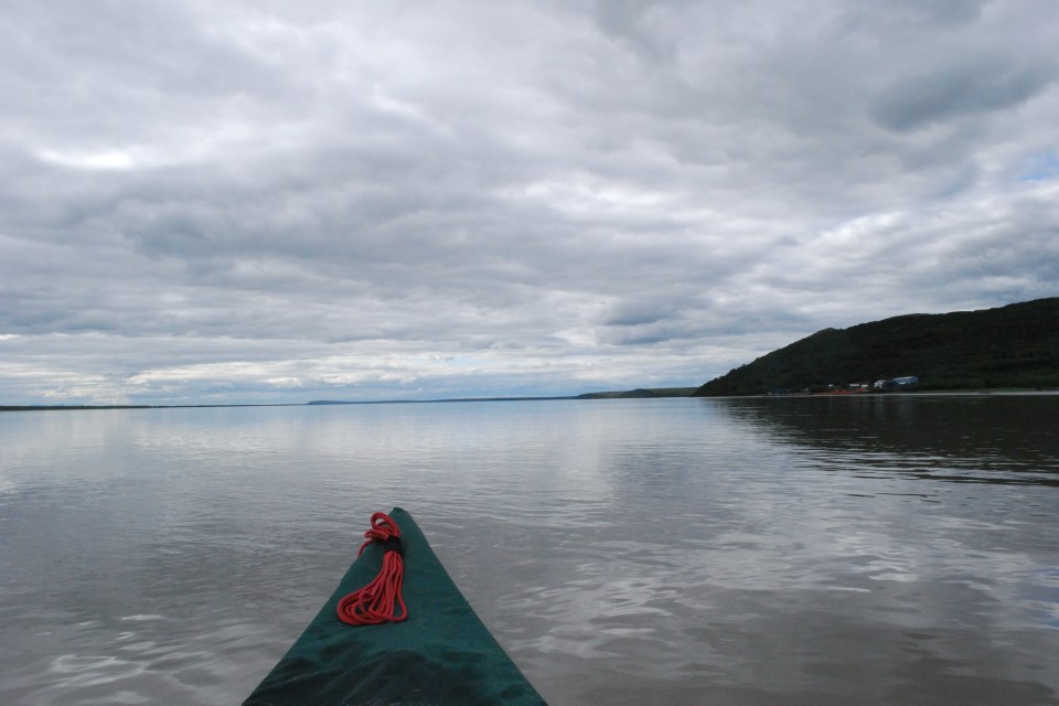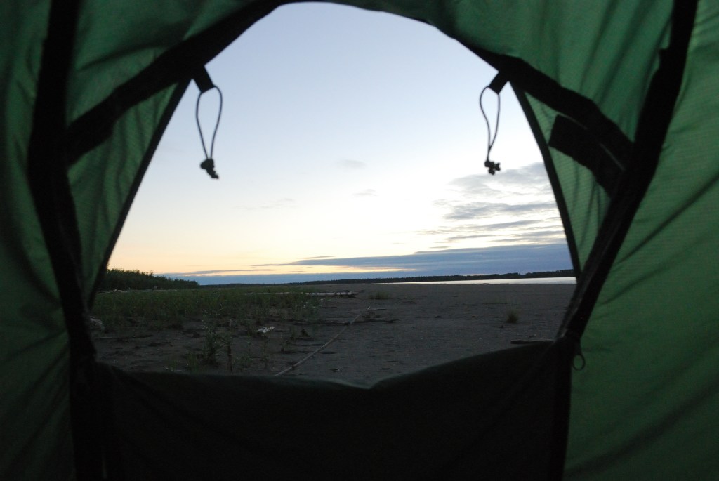 Nach der verdienten Pause ging es raus auf den Atchuelinguk, der nur kurz danach in den Yukon einmündet. Wie immer an den Einmündungen verwirbeln sich die Strömungen und es gibt kabbeliges Wasser, besonders wenn es windig ist – hier und jetzt war es aber nur etwas lästig. Schnell paddelte ich an den ersten Bretterbuden von Pilot Station vorbei. Als ich kurz anlandete, um nach einer guten Ein-/Aussatzstelle zu fragen, wollte man mir gleich furchtbar schöne Schnitzereien verkaufen. Ich beschloss, doch noch ein wenig weiterzupaddeln. Der „Strand“ von Pilot Station ist sehr weitläufig, und überall heizen die Jugendlichen mit Ihren Quads rum. „Wer sagt mir denn, dass die mich im Dunklen im Zelt sehen?“, fragte ich mich, als mir schon eine Traube Kinder entgegenrannte. „Ohje, das kann ja was werden.“ Ich nahm schnell die wichtigen Sachen unauffällig an mich, andere versteckt ich im Boot und schloss dann die Persenningteile, dann marschierte ich nach dem Beantworten von ein paar Fragen Richtung Dorf. Ich schnappte mir im Store nur eine Cola und einen Schokoriegel zum Sofort-Vertilgen und kaufte ein paar neue Äpfel, dann zog ich wieder Leine. Das Dorf war echt schön, aber hier war eindeutig zu viel los am Strand. Bevor ich hier noch rumsuchete für einen ruhigeren Platz, paddelte ich noch drei Meilen weiter zu Hill’s Island, wo ich auch erst nach einigen Versuchen eine gute Stelle fand (hier war zwar Ruhe, aber das Ufer war unfassbar matschig – kaum eine Möglichkeit, ordentlich anzulanden. Ich knabberte nur noch an einem Fischstreifen von George und fiel todmüde auf den Schlafsack. Sogar Fotos vergaß ich. Nur eines, dass ich aus dem Zelt heraus schoss, weil ich schon zu müde war 🙂