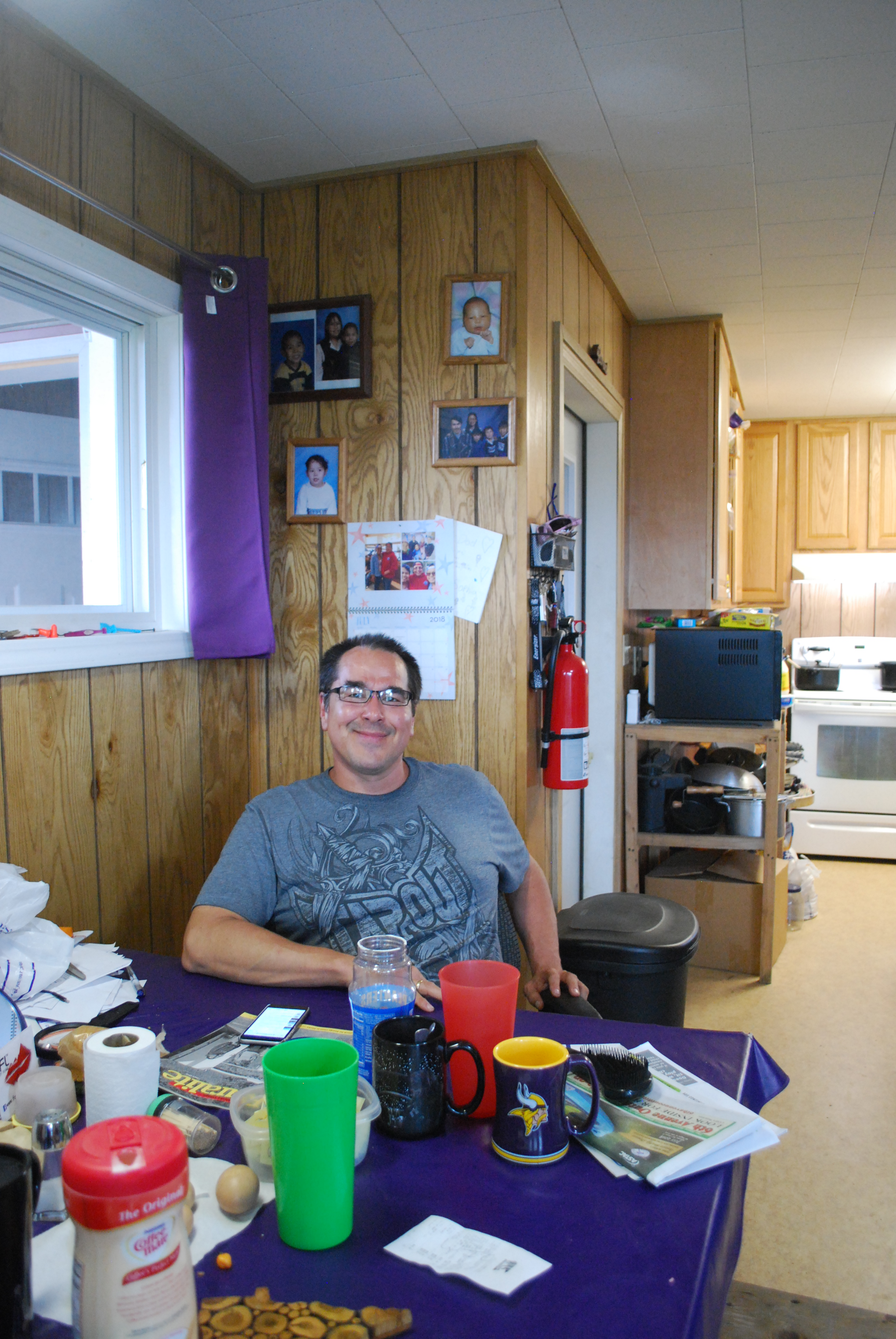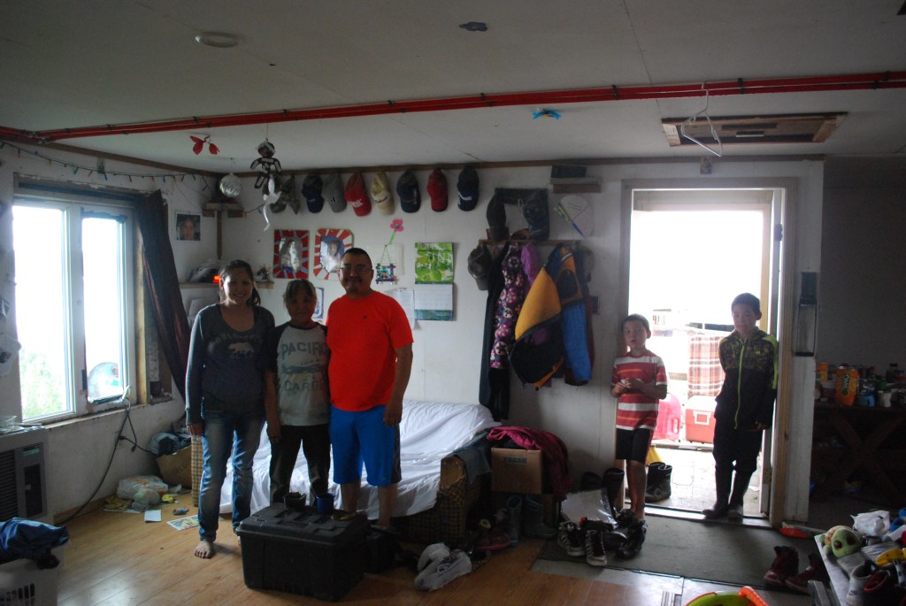 Jack meinte, ich könne ja im Anschluss den Marvin besuchen und sollte danach unbedingt nochmal bei ihm vorbeikommen. Daher ging ich zunächste zu Fuß – dann würde ich später besser einschätzen können, wo ich wieder anlanden musste. Jack war so etwas wie eine Mischung aus Feuerwehrmann und Seenotretter. Letzteres aber in der Regel eher „zu spät“. Die meisten, die in den Yukon fallen, tauchen nicht wieder auf und werden dann von Jack und Kollegen in langen Suchen und mit einem Schleppseil am Grund des Flusses meistens irgendwann gefunden. Er sei immer wieder überrascht, wie viele nicht richtig schwimmen könnten und/oder ohne Schwimmweste rausfahren mit Ihren Motorbooten. Hinzu kommt, dass sich die Sedimente des Yukonwassers blitzschnell in den Fasern der Kleidung (besonders in den Taschen von Hosen und Hemden) festsetzten und so die Kleidung unglaublich schwer machten. Man unterschätze dies offenbar – neben der Kälte des Wassers. Zu schöneren Themen: bei Jack und seiner Familie gab es Hühnchen und Reis. Ich dachte, ich wäre im Himmel, so lecker schmeckte es. Zum Abschluss bekam ich nach dem Familienfoto noch einen Beutel voll mit getrockneten Lachsstreifen, den ich nach einigen erfolglosen, dankend-höflichen gemeinten Ablehnungsversuchen dann doch annahm. (Ich würde nie wieder so etwas ablehnen – viel zu gut und ein Ablehnen ist unhöflich!) Schlussendlich wurde mir erklärt, warum ich nach Marvin noch einmal hierher kommen sollte, denn nachdem ich Jack ja schon vorm Supermarkt über meinen Plan, die nicht auf den USGS-Karten verzeichnete große Sandbank als Lagerplatz zu nehmen aufgeklärt hatte, wollte er mich abends „noch ein Stück mitnehmen“ in bzw. auf seinem Motorboot. Es solle schließlich später noch regnen und er habe flussabwärts noch eine Fischerhütte, zu der er wollte.