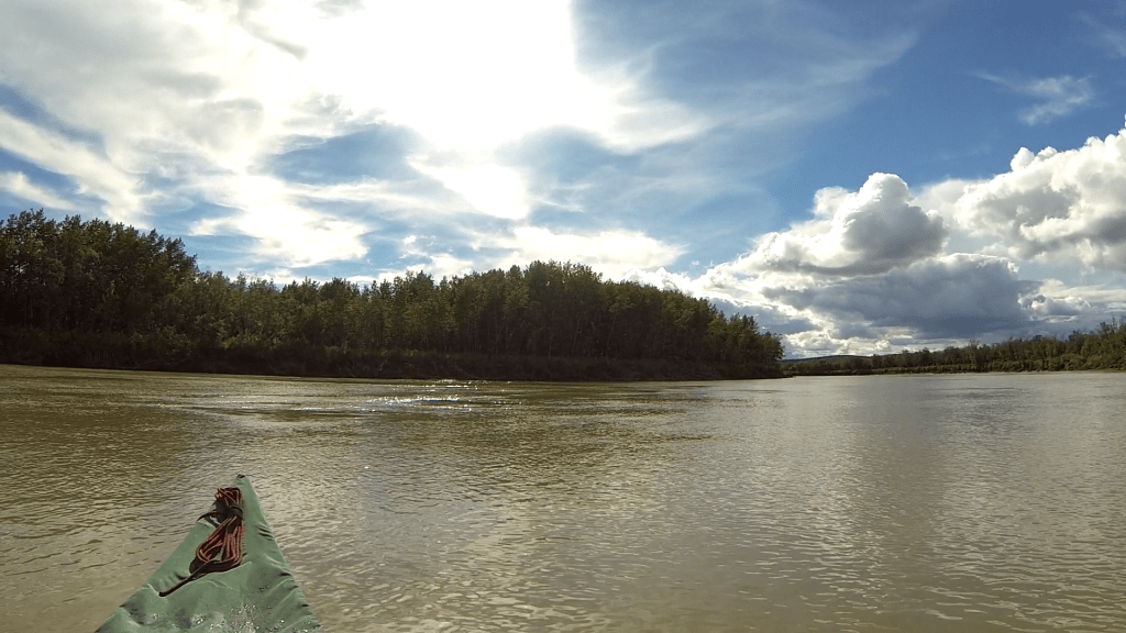 Das Wetter war kalt, windig und nieselig. Ich hoffte, dass es – wie üblich – abends besser wurde. Das Zelt hatte ich schon abgebaut. Einerseits, um bei einem guten moment keine Zeit zu verlieren. Andererseits, um mein Zelt nicht in der Gefahrenzone der Feuermachversuche von ein paar Einwohnern zu überlassen. Denn unter dem Unterstand war eine Feuerstelle, die der Allgemeinheit galt. Also tigerte ich ein wenig durch Grayling und versuchte über die Karte, noch ein wenig über den kommenden Flussabschnitt zu erfahren. Die Jugend wusste aber nichts, und ältere traf ich nicht an. Irgendwann wurde mir kalt und langweilig. Ich fand Unterschlupf in der Tribal Hall. Die Tür war offen, es war geheizt und Sofas zum Hinlümmeln standen herum. Puh. Meine Erleichterung währte nur kurz. Ich bekam Besuch von zwei jungen Männern, die erst furchtbar nett waren und hoch interessiert an mir und meinem Vorhaben. Schnell war jedoch feststellbar, dass die beiden (offenbar noch immer) betrunken waren. Die Flasche Wodka ging dann unverblümt zwischen den beiden hin und her (Last Chance war offenbar nicht weit genug weg?). In einem hellen Moment wurde sie mir auch angeboten, was ich jedoch dankend und so höflich es ging ablehnte. „Drink with us“. Gute Güte. Ich gab vor, zu nippen und reichte die Flasche weiter. Einer der beiden hatte ein blaues Auge. „What happened to you?“ fragte ich. „He disagreed with someone stronger“, bekam ich vom anderen lachend zu hören. Ich reimte mir eins und eins mit letzter Nacht zusammen. Draußen war das Wetter immer noch murks. Wo konnte ich denn nur hin, um alles in Ruhe auszusitzen? So lospaddeln war auch keine Option und hier bekam ich alles zwei Minuten die gleichen Fragen gestellt. Boa. Plötzlich gab es draußen Motorengeräusche. Eine Quad (oder four-wheeler) fuhr vor, jemand kam herein und zeigte auf mich. „You. Canoe guy. Come with me.“ Perfekt, dachte ich. Besser kann ich wohl „leider“ nicht weg. Ich entschuldigte mich und ging mit dem Neuankömmling nach draußen. Er deutete mir an, auf die Quad hinten aufzusteigen und los gings. Mich überkam das ungute Gefühl, dass dies vielleicht auch nicht die allerbeste Idee gewesen sein könnte, aber da kamen wir auch schon an einem Haus an. Drinnen erwarteten mich zwei Männer, die auf einem Sofa und auf einem Sessel rumlungerten und offenbar auch Langeweile hatten. Eine Wodka-Flasche stand in der Mitte. Innerlich verdrehte ich die Augen. Himmel. Der Herr des Hauses hatte fast vollständig zugeschwollene Augen. „I was shot.“ war die Antwort auf meine direkte Frage. Von wem und wodurch war nicht richtig aus ihm rauszubekommen. Nachdem ich auch hier irgendwann immer wieder die gleichen Fragen beantworten musste (what about the [dunkle dt. Vergangenheit]? And Volkswagen, good trucks?), schaute ich nach draußen. Immer noch so ein Mistwetter. Plötzlich zwei neue Besucher. Die beiden aus der Tribal Hall gesellten sich dazu. Mir wurde es zuviel und ich log, dass sich das Wetter verbessert habe und ich unbedingt jetzt los müsse. Ich verabschiedete mich und lief unter stetigen Aufforderungen, doch noch mitzutrinken, nach draußen. Der Quadfahrer fühlte sich offenbar befleißigt, mich sicher zum Fluss zu geleiten (diesmal ohne Quad). Er hatte beim Wiederanziehen seiner Schuhe links und rechts vertauscht, ging dafür aber recht schnell zu Fuß. Ich wollte hier nur noch weg, so leid es mir tat. Ich erinnerte mich an einen der Ratgeber für den hohen Norden. „Don’t stay in towns during the weekend unless you have friends or stay in a B’n’B.“ Oder „If you don’t fit in, find somewhere else.“ Es war so traurig und ich hoffte inständig, dass ich nur Pech hatte und allen, besonders dem Rest der Einwohner durch meine überstürzte Abreise unrecht tat. Schnell verschwand ich unten am Fluss im Kanu, während der Mann von der Quad noch wankend oben am Steilufer stand. Das Wetter hatte sich tatsächlich etwas verbessert und ich winkte ein letztes Mal.