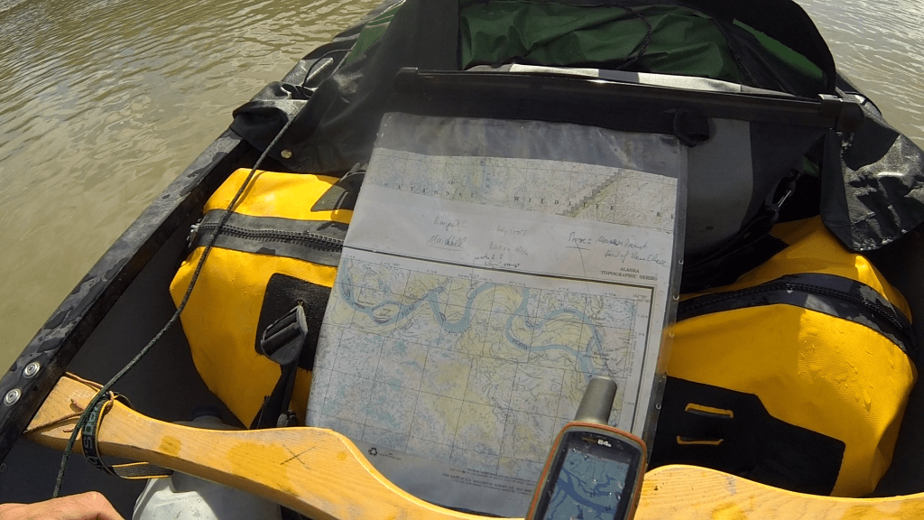 Dazu gab es drei Varianten zu paddeln. Zwei Eingänge zum Wilson Creek Slough vor und entlang Arbor Island, und einen einfachen direkt nach Arbor Island. Bei letzterem fürchtete ich, nicht schnell genug das Ufer von Marshall zu erreichen und am Dorf vorbei getrieben zu werden. Ich entschied mich also für den zweiten Abzweig in den Wilson Creek slough, was sich allerdings als gar nicht so einfach entpuppte (der erste Abzweig mündete nämlich genau am zweiten Abzweig wieder in den Yukon). USGS-Karten, die ausgedruckten Satellitenbilder von google Maps und das GPS-Gerät zeigten allesamt nicht übereinstimmende Ergebnisse im Abgleich mit der Realität. Ich verließ mich auf meine Intuition – goldrichtig. Was folgte, war eine elendig lang dauernde, eintönige Strecke, da die Strömung hier spürbar versackte. Wenigstens konnte man den Wind hier nicht so stark spüren.