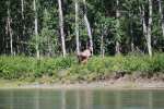 Also beschließe ich, erst einmal diese schäbige Stelle zu überwinden und danach wieder anzulanden. Doch plötzlich mache ich eine Gestalt auf der Rückseite der Insel (die den Creek eben in „geradeaus oder rechts“ aufteilt) aus. Längere Haare, könnte Franky sein. Plötzlich fängt die Gestalt an, sich auszuziehen. Was zur Hölle wird denn das? Und jetzt fängt die Gestalt an, durch den Fluß zu waten.