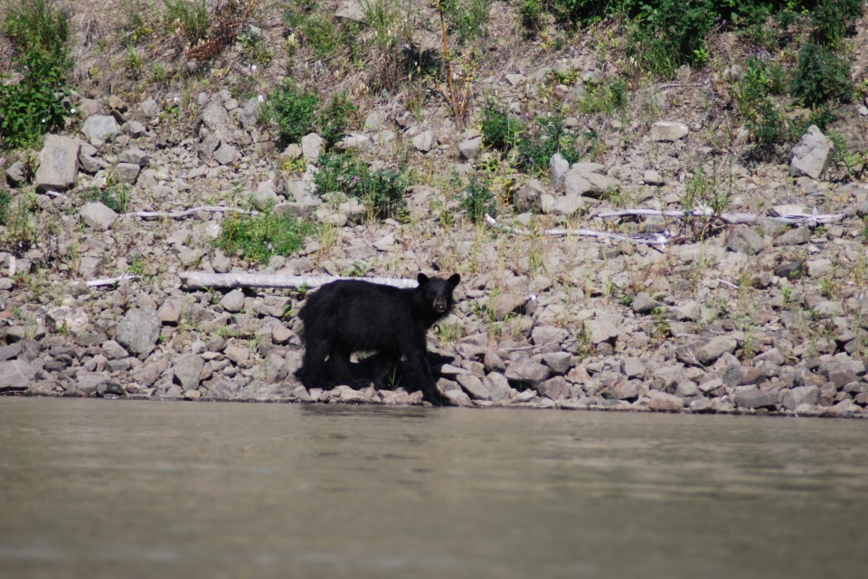 Puh, da war heute ganz schön viel los. Vielleicht kann ich ja morgen auch noch hierbleiben und ein wenig helfen, das ist bestimmt eine gute Abwechslung, denke ich. Ich gehe zum Zelt und krame ein wenig herum, um alles Bett-fertig zu machen. Mein Blick fällt auf die Schrotflinte. Ob ich die wirklich brauche? Aus einer Ahnung heraus erhebe ich mich und blicke auf. Ein schwarzer Meister Petz steht, nur gut 20 Meter von meinem Zelt entfernt, halb hinter einem Busch und erkundet schnüffelnd mit der Nase in der Luft das Camp. Ähh…. Ich versuche, mich groß zu machen und zu rufen, die Hände über den Armen. Es interessiert ihn nicht, und er bewegt sich auch nicht irgendwohin. Die anderen sind schon im Bett? Was jetzt? Bärenspray. Nee erst die Flinte. Erst laden, aber geknickt lassen. Dann Bärenspray in die andere Hand, zur Not fallen lassen. Aber was will ich denn tun? Wenn ich ihn verscheuche – der kommt doch wieder? So gehe ich also, den Blick immer auf dem Bären, zum Haupthaus und rufe die anderen wieder heraus. Der Bär wird von heute morgen wiedererkannt. Die Entscheidung ist schnell gefallen. Wenn der heute morgen verscheucht wurde und jetzt schon wieder da ist – es sind auch drei kleine Kinder im Camp. Tom holt die Shotgun aus dem Haus und geht ein paar Schritte auf den Bären zu, dann in die Hocke. Ein Schuss, und der Bär liegt am Boden, die Tatzen zucken noch. Noch ein Schuss. Warten. Der Bär, er ist tot. Doch was tun mit dem toten Bären? Kein Problem, Schwarzbär kann man essen. Flugs werden die Pfoten mit einem Seil zusammen gebunden und der Bär runter zum Wasser gezogen, an meinem Zelt vorbei. Vorbei? Nicht ganz. Bevor ich richtig registriere, was passiert, ziehen wir den Kadaver über die Sturmleinen meines Zeltes, Blut bleibt zurück. Aber es ist keine Zeit für so einen Firlefanz, wir sind schon am Fluß. auf einer Plane hieven wir den Kadaver ins Boot und fahren raus. Hat jemand ein Messer? Ja klar, ich reiche Tom das Puma-Jagdmesser, das ich mal von meinem Vater bekommen habe. Schon ist der Bauch fein säuberlich aufgeschlitzt und die Eingeweide werden versenkt, dann fahren wir zurück.